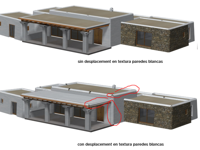 Hola, tengo el problema de que cuando aplico displacement a un material (pared rustica) y aplico este material a una malla que he importado a 3ds Max desde AutoCAD, al hacer los desplazamientos, me abre la malla en las intersecciones. Querría dar como una imperfección a las paredes, tipo bultos o algo así, adjunto unas imágenes parque que veáis lo que digo con y sin displacement.