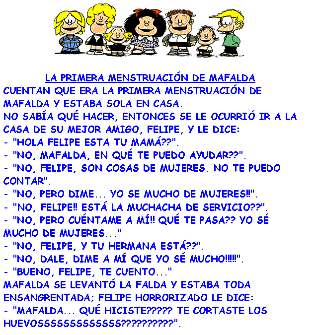 Hola. Solo creo que vale aclarar que ese chiste no pertenece al gran quino (autor de Mafalda) y que es más viejo que la humedad. En este caso alguien uso los personajes de quino para relatarlo. IkerClon. El proverbio que pones en tu firma está bueno y no sé porque me hizo acordar a algo que mi viejo siempre me repetía cuando me ponía caprichoso y quería terminar con la razón aun sabiendo que no la tenía: es mejor permanecer callado y que la gente crea que eres un idiota a que abrir la boca y ya no les quepa ninguna duda.