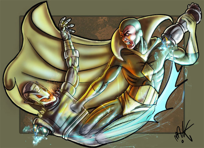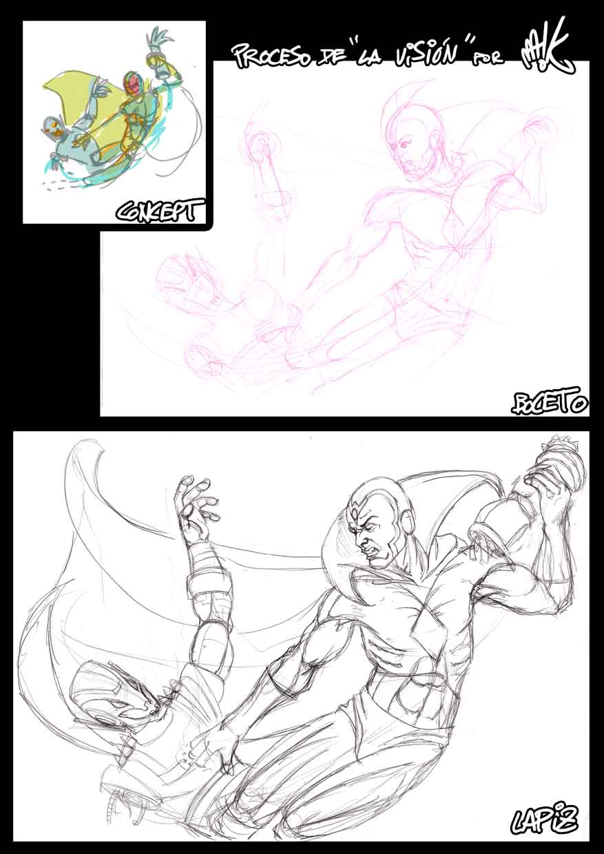 He perdido dinamismo en el proceso, si os fijáis, el concept es más fluido. Pero creo que la visión es más majestuoso que otros héroes y creo que no tendría que torsionarse tanto y he intentado darle esa sensación de dinamismo griego, menos dinámico, pero más serio, majestuoso y armónico. Todavía estoy pensando si la visión debería gesticular tanto con la cara, pero no sé, supongo que, arrancarle un brazo a ultron cuesta lo suyo.