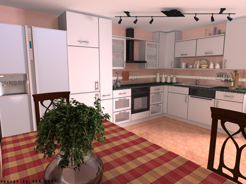 Hola a todos aquí os dejo esta cocina a ver qué os parece. Software LightWave + Fprime. Utilicé dos luces de área una dentro de la cocina y otra fuera.