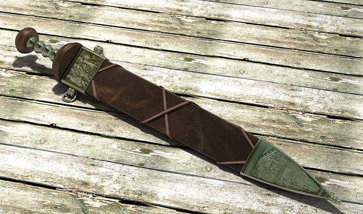 La verdad es que tengo una espada de verdad romana que compre en una tienda de antigüedades, es decir no pretendo representa algo antiguo, sino exaltar la artesanía de la época, y transportarme un poco en el tiempo. Sinceramente pienso que eso de hacerle cosas para que parezca envejecido está muy visto.