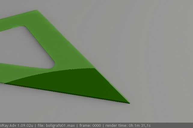 En un principio para iluminar la escena utilice HDRI pero visto que me salían manchas pues ilumine con un environment blanquecino, para los valores de iluminación global utilice unos estándar -3; -3 y con un adaptative subdivisión -2; 2. Él caso es que cuando renderizo y según el punto de visión de la cámara se me peta más o menos parte de la escuadra. He probado cambiando todo tipo de valores. Sin sombras, sin cáusticas, con los valores de generación de iluminación global, pero no he conseguido arreglarlo. Mi último pensamiento es que Vray no renderice bien los materiales transparentes si son standard, quizá debería usar un material Vray ¿pero cómo darle transparencia?
