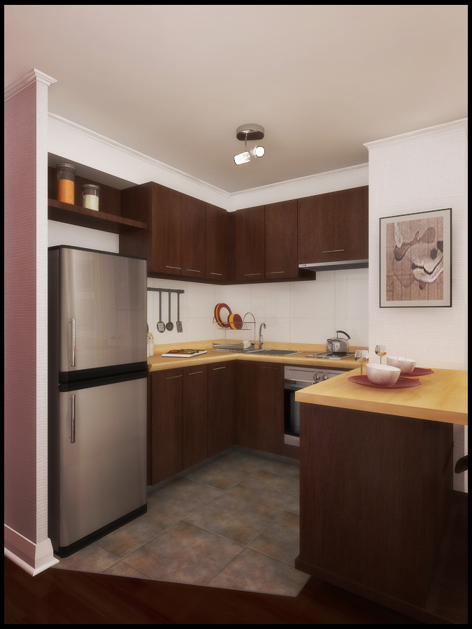 Para estar iluminada con omnis te ha quedado muy bien, aunque no me convencen ni las copas ni el frigo. En la segunda imagen hay algo rojo que te está tiñendo la pared de la izquierda.