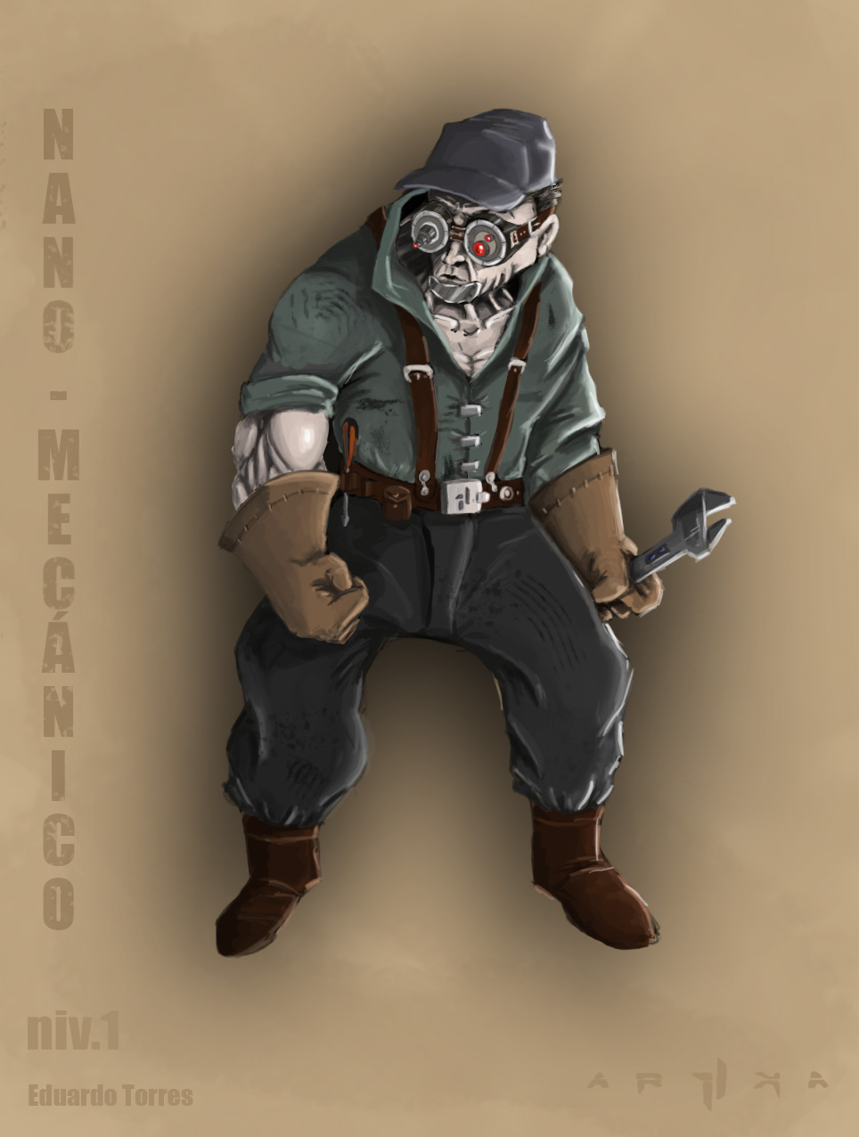 Pues eso mismo, aquí os dejo un concept que e realizado para el proyecto artika. Se trata de un mecánico que trabaja en una base militar por el año 2100 y pico, el cual, ha sido infectado por unos nanobots que poco a poco lo irán transformando en máquina, ese es el nivel 1 de infección, hay 2 más.