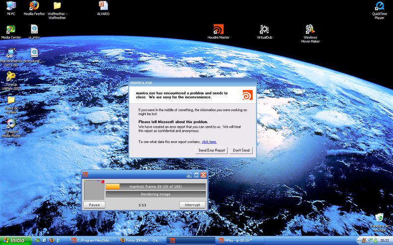 Bueno, aquí os expongo mi problema, me he descargado la última versión del beta de houdini9. Me encanta el programa, pero cuando voy a renderizar para observar bien mi obra, pues ni a mitad del render de mantra me aparece un eror que no sé si se puede solucionar, supongo que, no, pero si alguien sabe algo, le agradecería que me lo dijera. Gracias por adelantado y saludos.