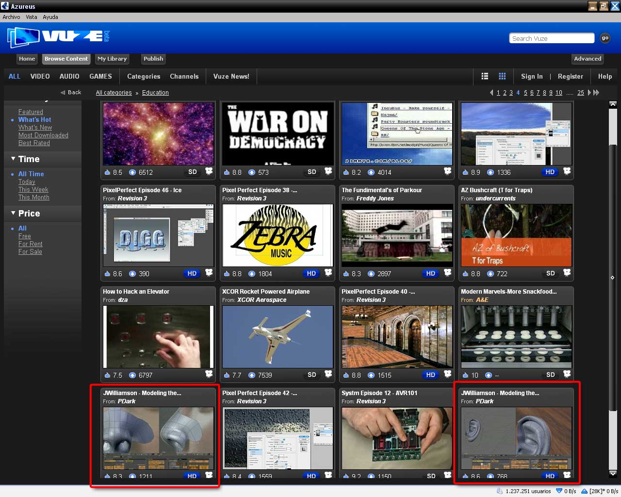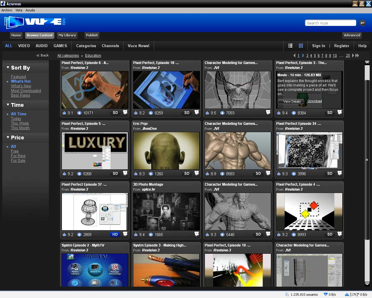 Supongo que la mayoría ya lo, pero para los que no, voy a hablaros de azureus vuze, se trata de una versión del famoso cliente bittorrent azureus, en el podemos navegar y buscar (de forma interna), una cantidad ingente de material gratuito y legal (también de pago, pero hablaré solo del gratuito), tráilers de películas, cortos, vídeos musicales/conciertos (me he bajado el videoclip noviembre rain de Guns and Roses en Hd, cuánto tiempo si oír ese pedazo de tema), combates de artes marciales (creo haber visto también boxeo puro y duro), documentales, videojuegos (y me refiero a los títulos más famosos, aunque claro está, luego hay que comprar la licencia para poder jugarlos), making of, documentales, series de televisión, exhibiciones de coches tunning, conferencias, yo que sé, hay la tira de material.