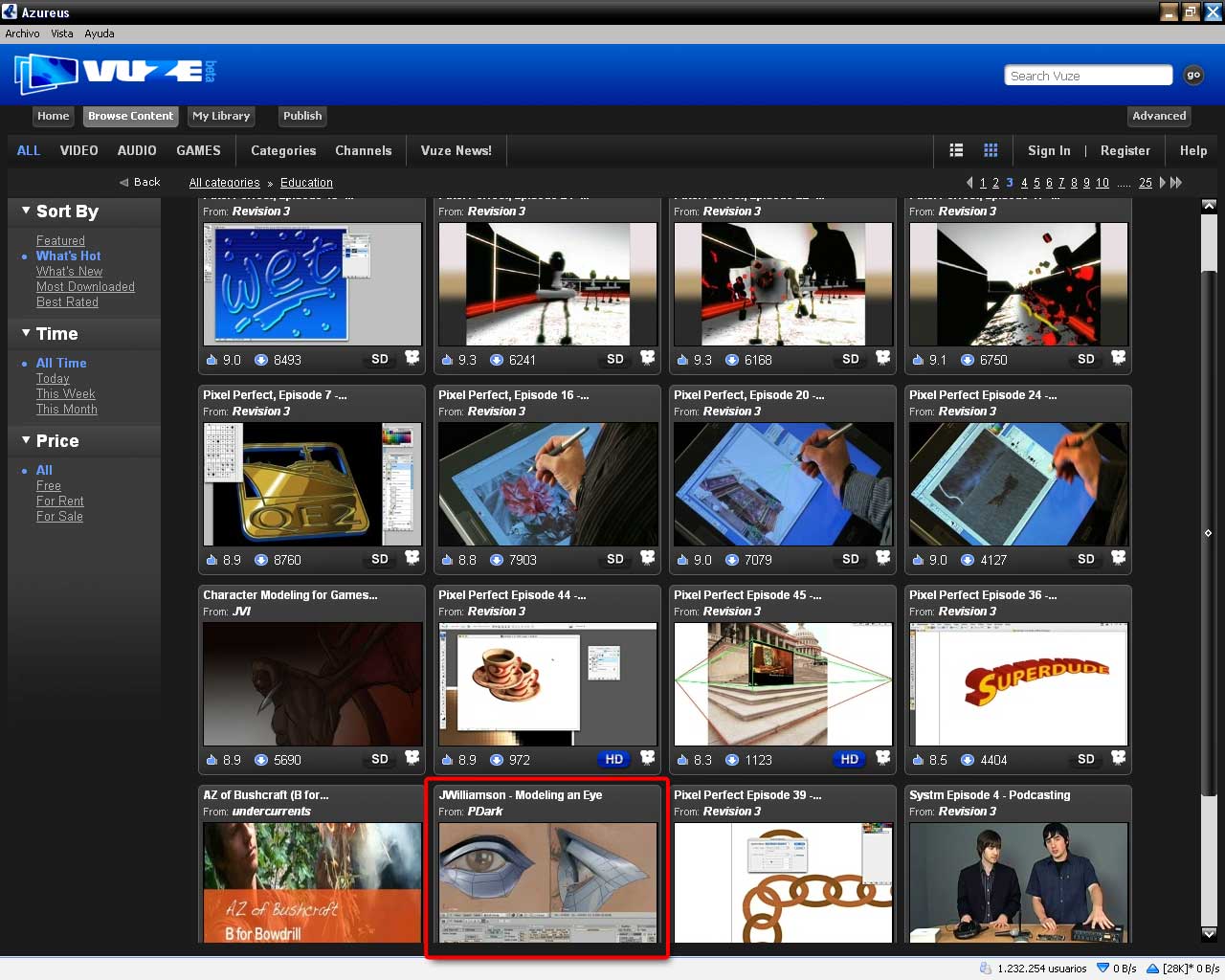 Sobre nuestra industria, aparte de cortos, making of, tenemos una cantidad de nuevo ingente de material, en la categoría education, tenemos videotutoriales de Blender (el del Siggraph 2007 está muy bien), modelado de personajes para videojuegos en 3ds Max y ZBrush (es una serie, en total serán unas 6 horas, es una pasada), a Adobe Photoshop lo destripan todo, todo, hay material sobre edición de vídeo, dibujo, hardware, yo que sé, engancha, es un vicio, hay material para aburrir a ciento y la madre, una gran parte del material está en Hd, y los que no, yo hasta ahora todo lo que me he bajado no Hd, tenía calidad DVD o muy cercana.