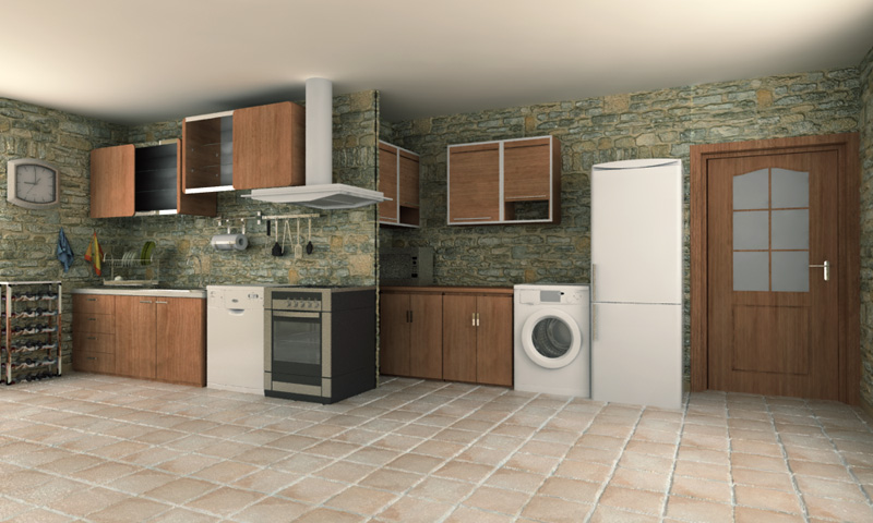 No lo mire mucho, pero a mi criterio el reloj, es para que lo vea todo el mundo o las personas que viven ahí? (digo, por el tamaño) y también para mí criterio, esas piedras no son para usar en una cocina ya que son muy sucias, y las paredes nunca se limpian, y eso junta mugre, la iluminación me parece buena, estaría bueno que a la puerta, en vez de ese gris le pongas algún fondo verde, u otra cosa, el piso tiene mucho Bump, para caminar por ahí es lo mismo que escalar una montaña, me parece que la imagen ganaría más con otro, la heladera sigue a abajo del piso? Me da esa sensación, la campana esta buena, parece grande, pero está bien, y le pondría algo en el camino, o una persona o una mesa, también ganaría más la imagen.