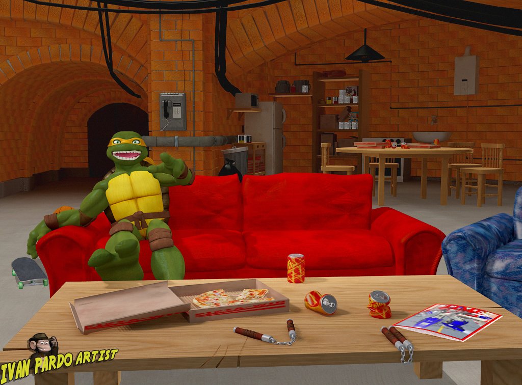 Al ser una cloaca ten en cuenta que es un sitio totalmente cerrado que no entra nada de luz del exterior así que, la luz provendra de sitios muy concretos de la estancia, una luz muy artificial que surge de focos e iluminan toda la habitación, en cuanto a los modelos no me gusta la textura de los sofás (demasiado poco pensada o trasbajada) y la cintura de la tortuga la veo demasiado fina, por lo demás si trabajas bien la iluminación y el entorno te va a quedar algo muy bueno.