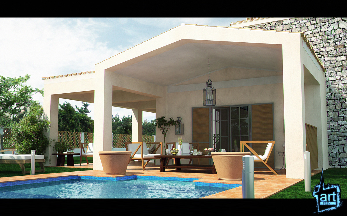 Hace tiempo que no subo nada y ya era hora de mostrar mis últimos trabajos de infoarquitectura. Este es un render exterior de un chalet con piscina.