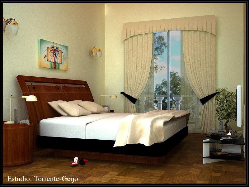 Lo primera impresión es buena, pero, estoy de acuerdo con mi, si la luz procediera de la ventana ganaría muchísimo, también deberías mirar los parámetros de sombra, porque no creo que los zapatos, las mesitas de noche y del televisor estén flotando, aunque lo parezca, más bien creo que necesitas más resolución de sombra, si pones los parámetros quizá podamos recomendar unos ajustes. Un saludo.Yo replantearía de nuevo la iluminación, da la sensación de que la luz viene de una ventana detrás de la cámara, cosa que sería bastante rara. Ya que le has puesto una ventana en el fondo de la composición intenta iluminar la escena desde ahí, seguro que te queda mucho mejor.