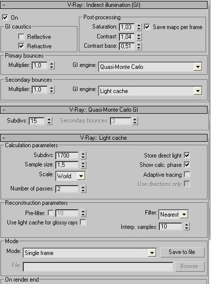 Cada uno tiene su método, pero yo usaría de GI primario Irradiance Map y de secundario Quasi Montecarlo (esta combinación me da muy buenos resultados en tiempo calidad) o Light Caché (el problema es que según como, ilumina esquinas que deberían ser oscuras o hace fliqueos), lo seguro es que no pondría más de 1000 en Light Caché por demora de render. Un saludo.