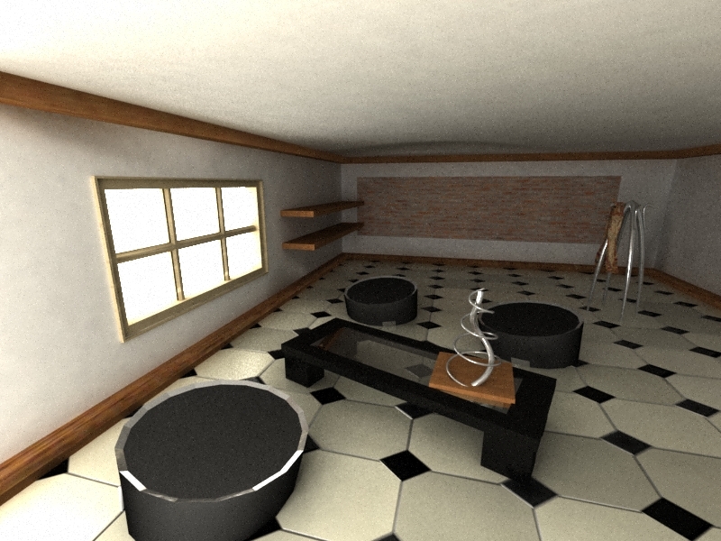 Vaya, bueno el interior podría ser una de las pesadillas de un claustrofóbico, la idea es buena, pero deberías replantear la situación de la cámara, como concejo te diría que la bajaras un poco (esta pegada al techo) y replantea el valor del lente es lo que hace que se deforme de tal manera, con respecto al exterior, bueno lo dicho los mapeados no pegan más que el de la grama, el de la escalera y novedoso el concepto de árbol levitante, el trabajo tiene buenas ideas solo falta retocar un poco y ya está. Saludos.