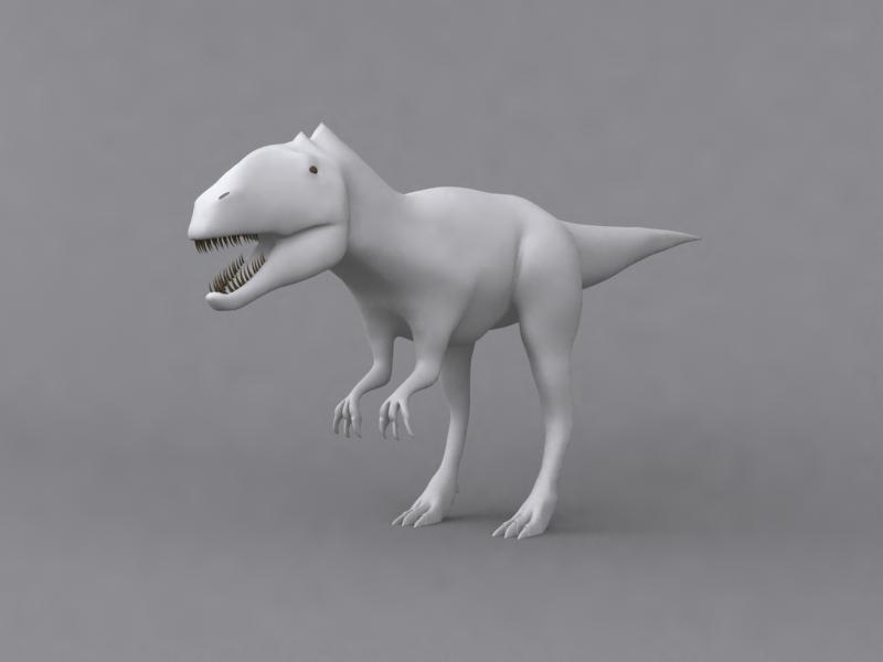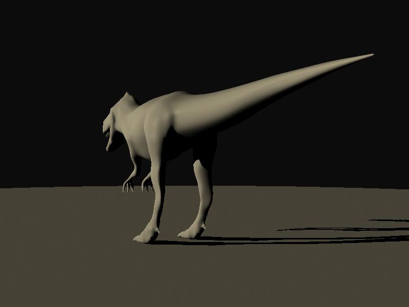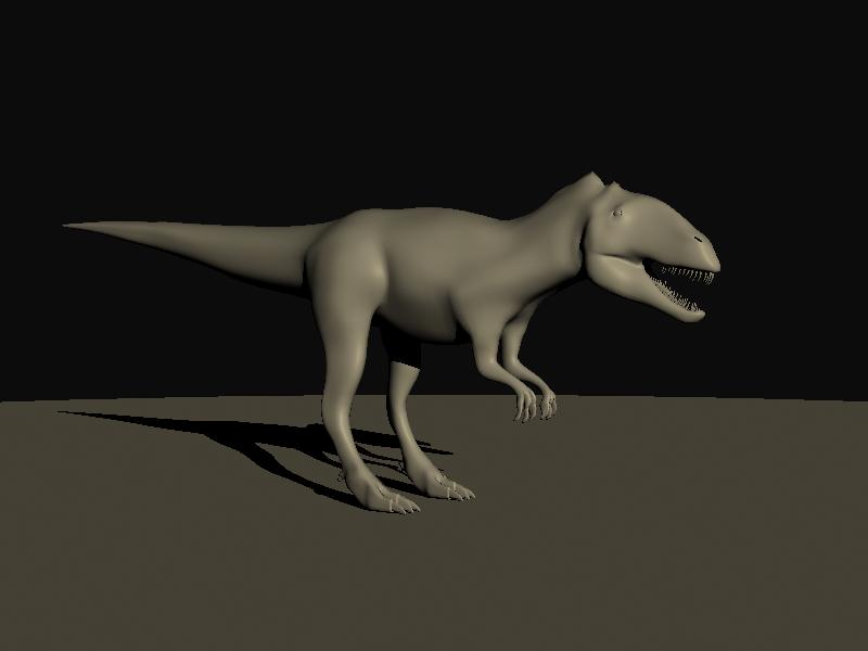 Ese dinosaurio no está nada mal para ser el primero, la base no está mal solo te falta mefinirlo un poco más, las patas trasera está un poco raras deberías de darle un poco más de forma y que se pidiese distinguir el muslo, las rodilla, la pantorrilla, el tovillo, y le tarso.