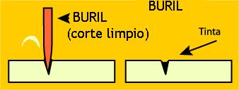 El buríl corta el linóleo como la mantequilla, de un corte limpio, y no deja rebaba (ninguna), entonces la impresión (línea) es más limpia.
