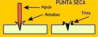 La punta seca va apartando el metal hacia los lados, no lo arranca, además el corte es rugoso, esto hace que la impresión sea mucho más expresiva, variando los ángulos de corte y la presión emitida, véase diagrama adjunto.