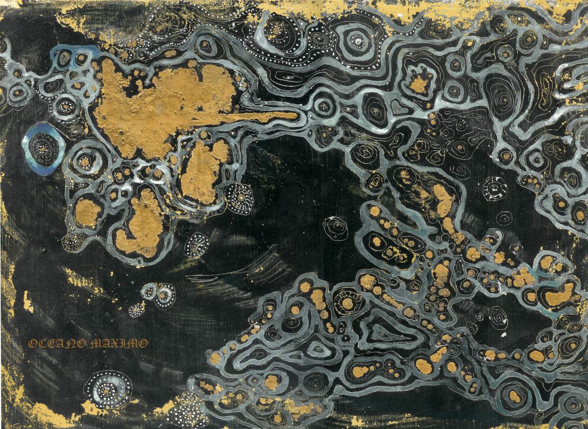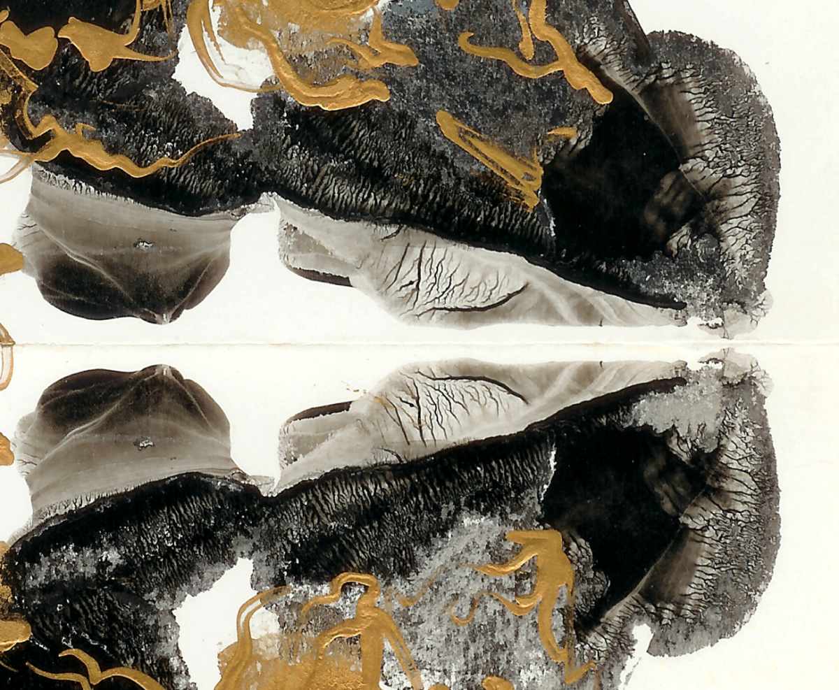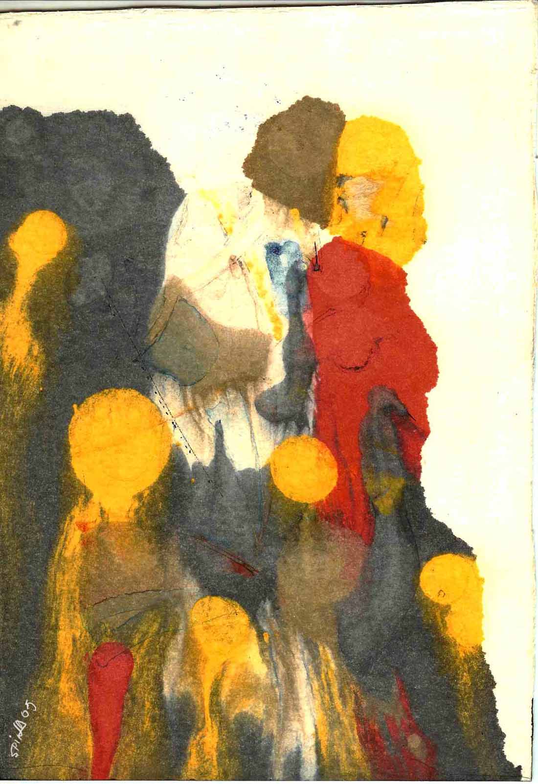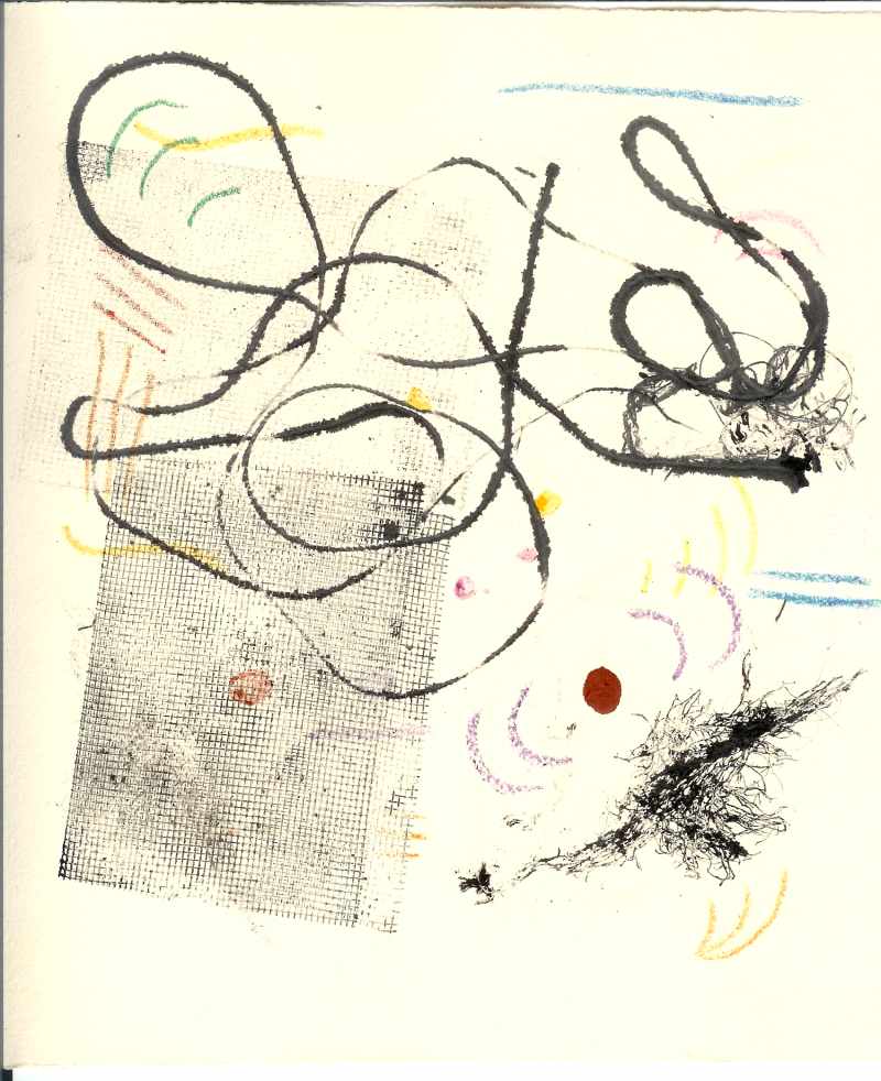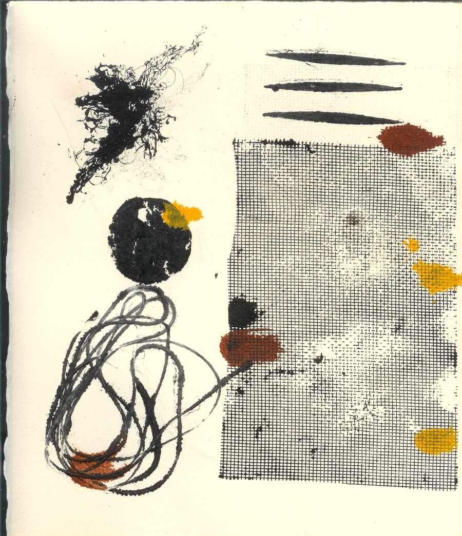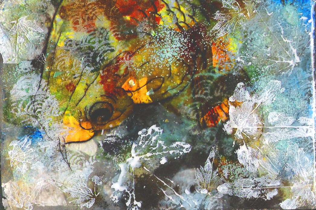 Pues a mí parecer, que es mucho imaginar, creo que has dibujado con alguna especie de tintas transparentes sobre no sé qué superficie, y luego has estampado en varios tonos de acrílico o tintas opacas y colores sobre este dibujo.