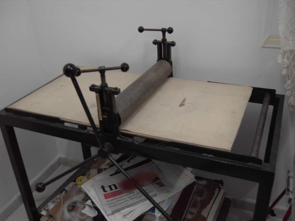 Después se entinta toda la placa y se va retirando la tinta de esta poco a poco y con mucha paciencia, dejando más donde quieras más y por supuesto en la llaga, (lo que será después la línea) y de aquí al tórculo o rodíllo de prensa, donde según la presión y el papel usado te puede salir un churro o una patata quantica.