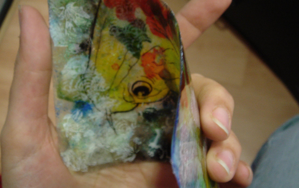 Posdata: creo que son: capas de Kato líquido, con tintas piñata, polvos embossing, purpurina, Flakes irisdecentes, pan de plata, Pearl-ex, y la carpa se ha dibujado directamente sobre la arcilla.