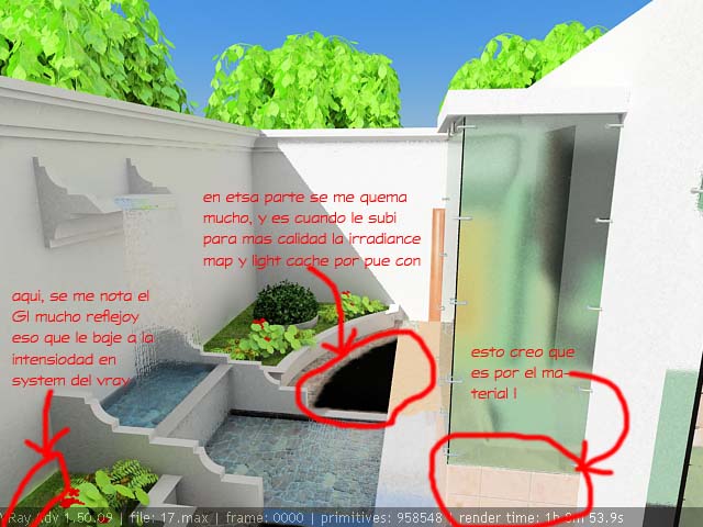 Bueno estoy comenzando con un interior en proceso, es mi primer interior, algunos materiales los puse un poco parecidos a la realidad, pero no están tan mapeados, solo con la intención de calcular una iluminación un poco parecida, pongo dos imágenes, una externa más una interna, con sus respectivas dudas, a ver si me pueden criticar o sugerir lo que sea, muchas gracias además van img de los seteos del render.