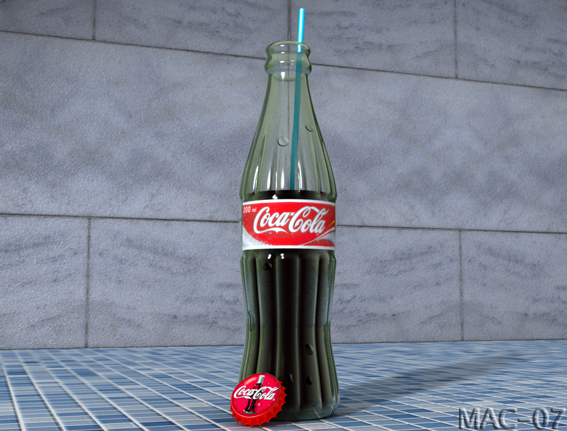 1), coca cola: he usado una luz spot para las sombras a 0,5 de intensidad y una Vray Light a 0,7. Con un subdivisión de 30. He puesto un RayTrace al suelo, pero no he conseguido que me refleje mínimamente la botella en el mismo.
