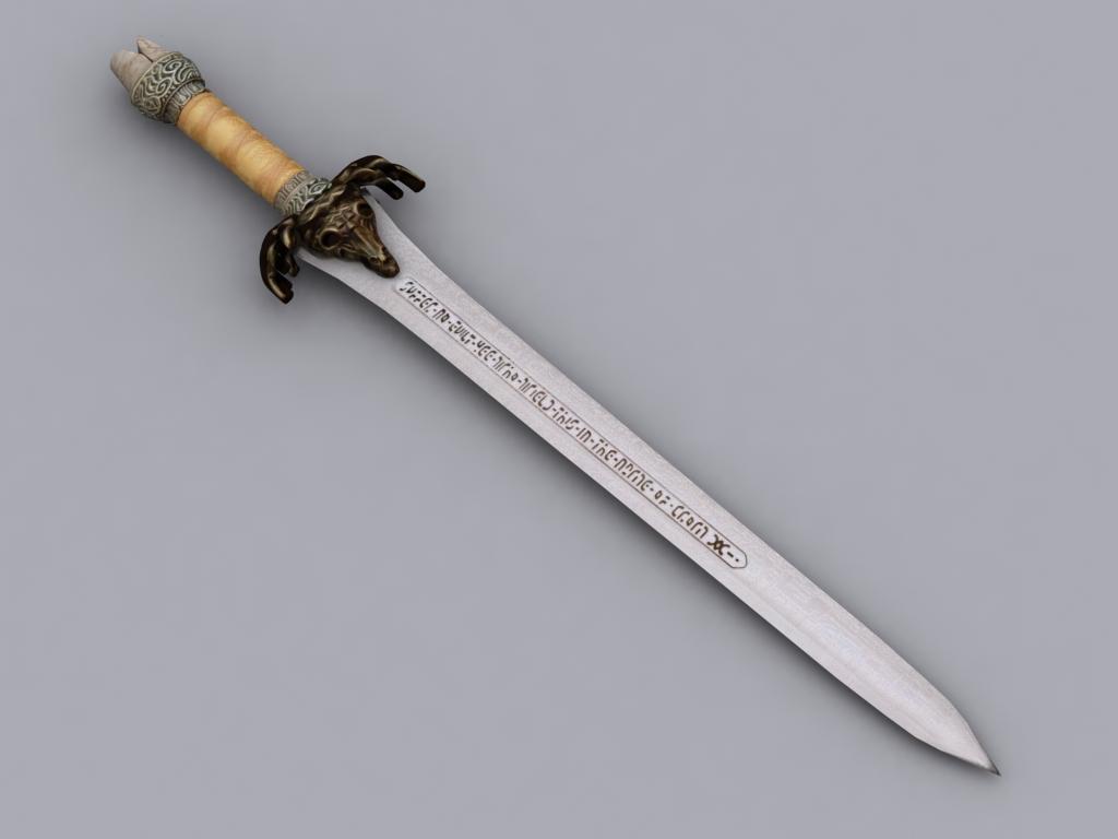 Me gusta cómo ha quedado esa espada. Tan sólo veo raro la textura del adorno de la empuñadura, no queda muy claro si son cuernos de cabra o qué. No sé, quizás el material de la textura, tiene brillos raros, ¿no?