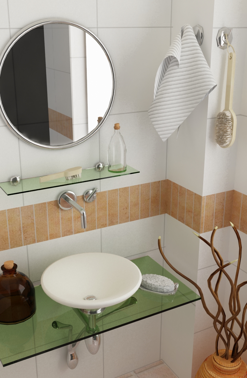 Y luego cuestión de detalles como, quitar la tapa para que los juncos, bambues, no lo atraviesen(solo importante si haces una imagen detalle de esta zona). La caja de la repisa como te han comentado ya queda poco real. El material del taburete es demasiado, limpio, brillante. No sé, trastea si te apetece la escena probando cosas, el espacio da mucho juego de decoración. Un saludo.