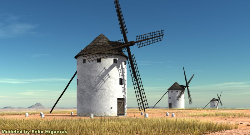 Hola a todos. Esta es la imagen nueva de la escena de los molinos utilizando el Shag Hair para el 3ds Max 6, he tenido muchos problemas con el porque algunos de los parámetros no funcionan correctamente como el de la orientación y el de doblar el pelo en este caso la hierba.