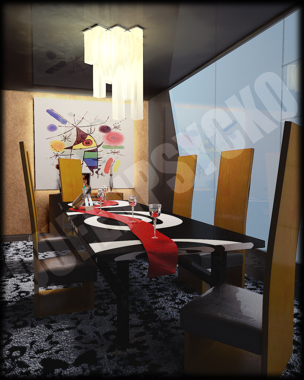 Qué rallada, es curioso, diferente, no me gusta demasiado la alfombra, ni el mantel, en cambio las sillas son interesantes, aunque en el asiento de la que está en primer plano parece que el tapizado tenga cuadros. ().