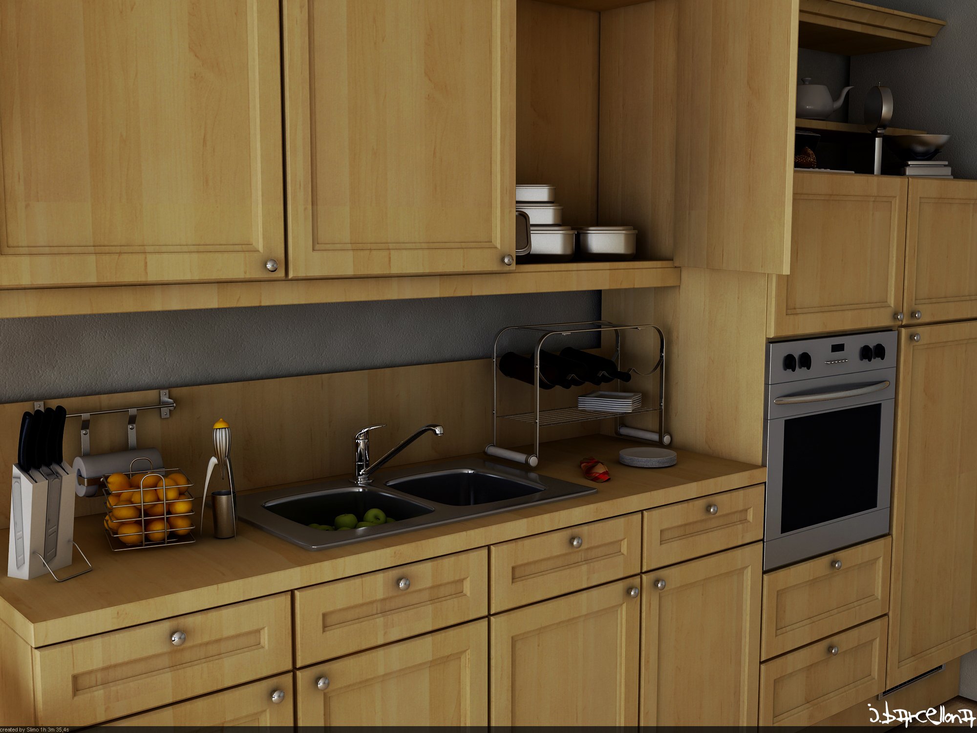Hola aquí dejo una imagen de una cocina es una prueba de cómo va quedando la iluminación de después la llenare con más cosas quería saber que les parece la iluminación y si viene con algún consejo no me quejo con rima y todo, bueno gracias.