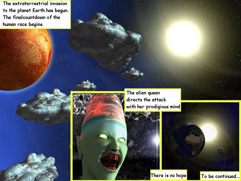 Hola a todos y a todas, las naves me recuerdan bastante a los cruceros de Star Wars, y la reina alien a las medusas de la introducción del héroes of might 3. ¿son modelos propios? Cómo sugerencias, estoy de acuerdo con Txoldo y además haría los cajones del texto transparentes un 40% más o menos. También intentaría hacer los Marcos de las viñetas rotos, a lo Todd Mcfarlane, o incluso algo más gigeriano. Un Glow en el culo de las naves también quedaría majo, oscureciendo un poco más el azul en la primera viñeta.
