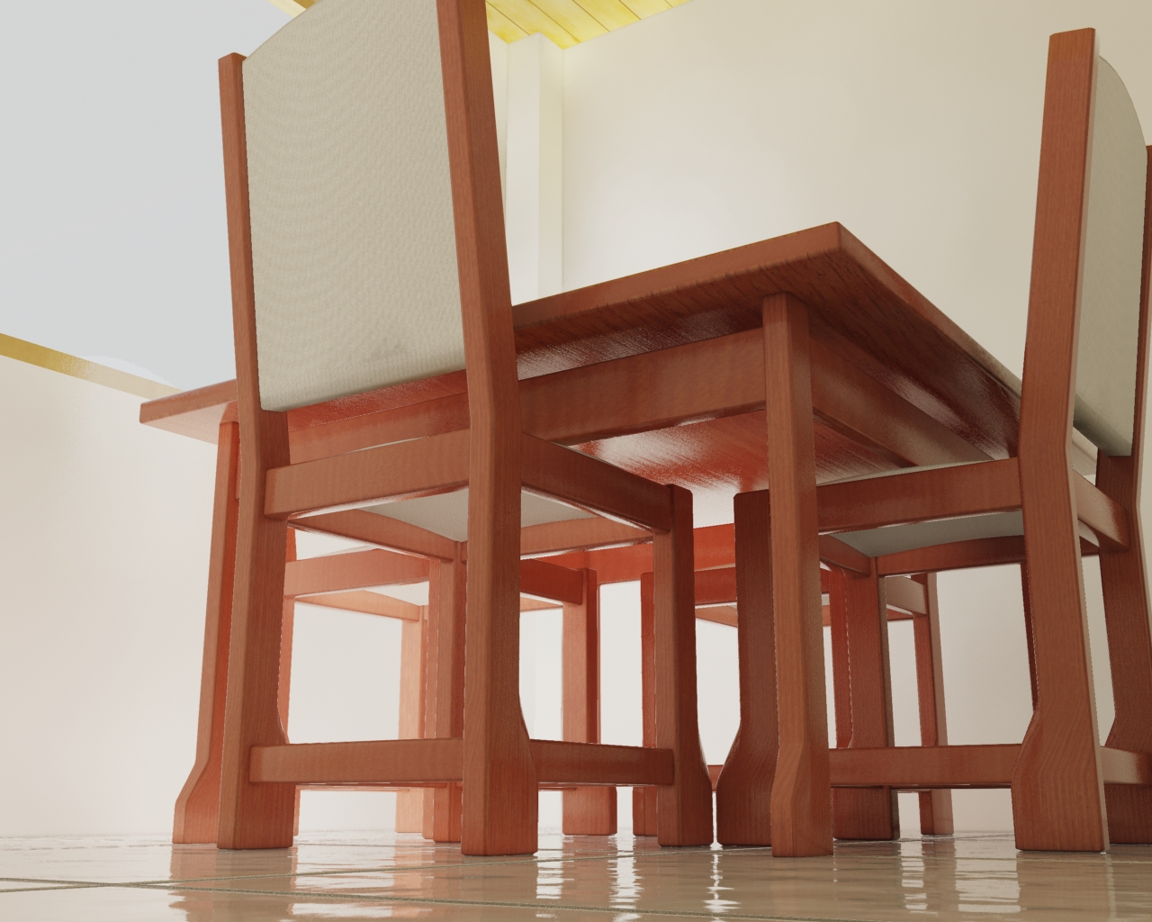 Hola mlms. Yo echaría un vistazo a la textura, en algunas zonas parece que está estirada y se hace raro que la veta de la madera acompañe a la forma del modelado y las proporciones de altura de los asientos respecto a la mesa, como ya te comento Arqnet. Me gustó el punto de vista que elegiste. Un saludo.