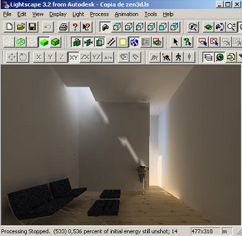 Con estas cosas dichas (y otras que debería y que dejaremos para algún tutorial de cómo utilizar Lightscape como herramienta de cálculo de iluminación real (con análisis de resultados por superficies, si puedo algún día) nos será de ayuda a la hora de elegir la iluminación del programa.