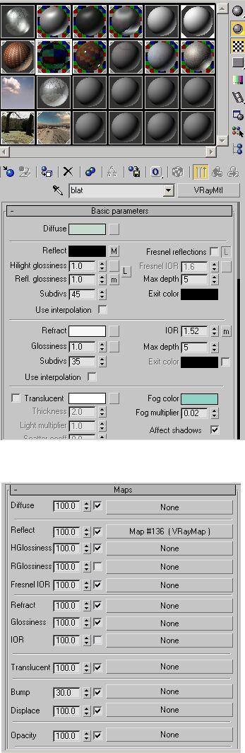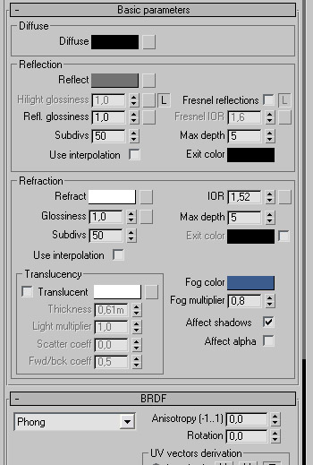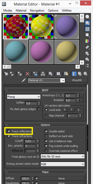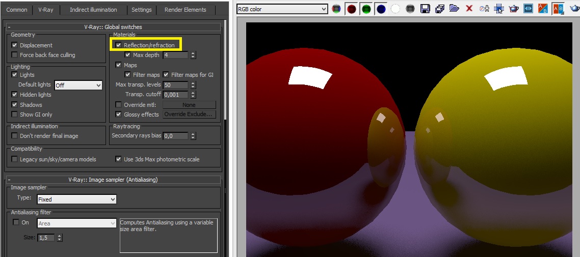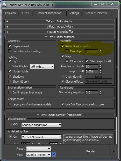 Si tienes problemas con los objetos reflexivos, al hacer un espejo tendrás que elevar el depht de la reflexión en el material, sobre todo cuando la cámara ve a través de un objeto transparente (refracción) y detrás va el espejo, si esta por debajo o igual a 5, es válido solo para la mayoría de renders, en casos como el que te menciono, tienes que elevar la profundidad de rayos trazados, depth, a 7 o más, este es el número de veces que un rayo viaja de la luz al objeto, y a otro objeto, y a la cámara, cuánta más profundidad, más información recoge de la escena, más cálculo, y mayor tiempo de render.