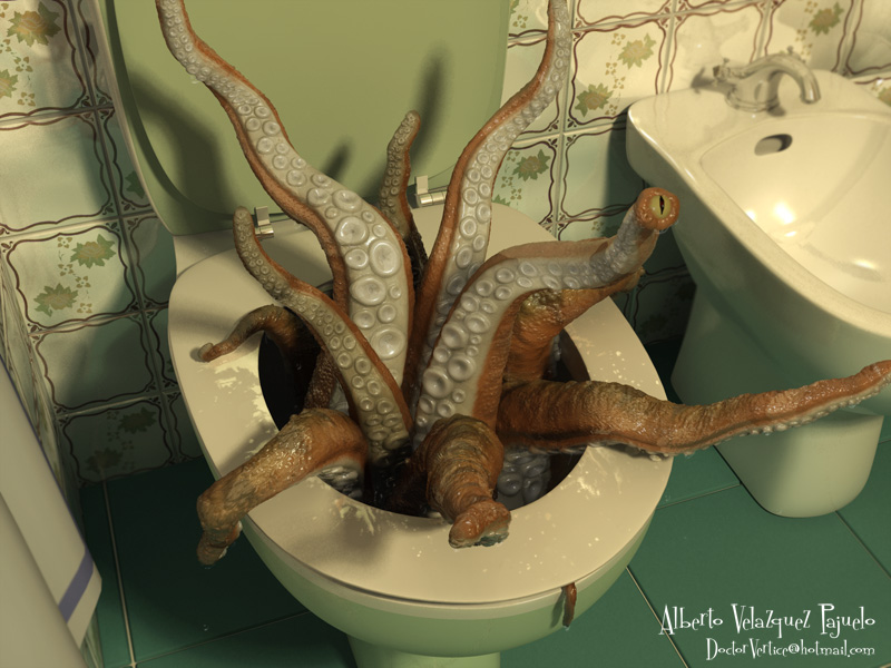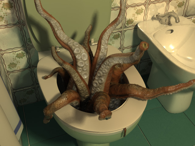 A mí me sigue pareciendo un poco plástico. Siento no poder ayudarte en esto, pero es que, no tengo ni idea de Shaders. Lo que sí que creo que te podría servir es humedecer la tapa del water que está debajo de él, simulando que ha salido hace muy poco y ha mojado todo, hacer un pequeño charco en el suelo y algunas gotas cayendo de los tentáculos.