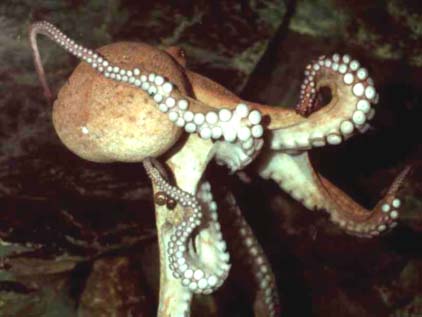 Y si quieres rematar la faena, puedes ajustar la escala del Bump/desplazamiento de los tentáculos, se ve muy grande, así mismo, por la parte de las ventosas, la carne del pulpo se ve muy lisa, y eso es otra de las cosas que hace que parezca de plástico, además que creo que las ventosas deberían ir en dos hileras, y ajustándose en escala de mayor a menos desde el interior hasta las puntas, en el tuyo siguen esa forma, pero están muy desordenadas y algunas muy deformadas, (mira la fotografía que te adjunto), también para mí gusto creo quelas ventosas necesitan más grosor, las tuyas están muy achatadas, cuando un pulpo muere, se contraen las ventosas, pero siguen teniendo la misma longitud, pero arreglar esto ya te llevaría algo más de tiempo, tu sabrás como has acabado de cansado del pulpo.
