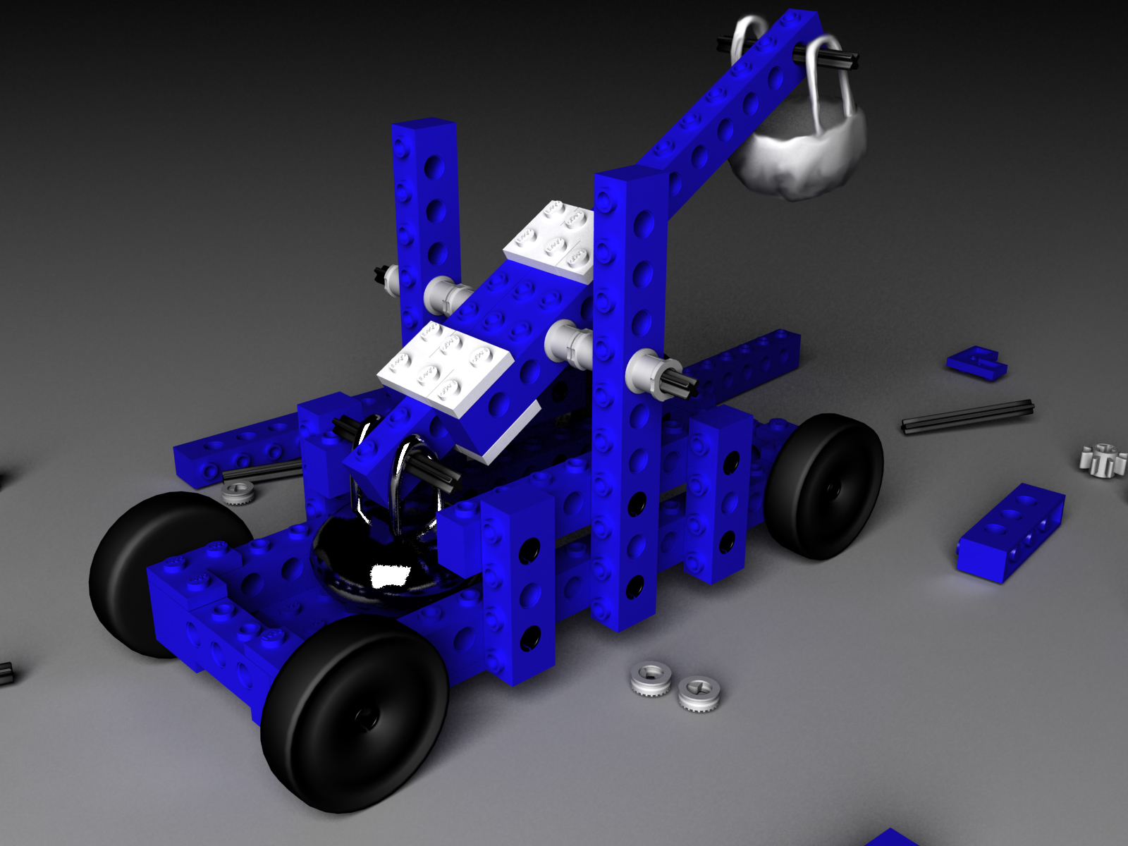 Gente aquí dejo una imagen finalizada con una catapulta armada. Espero que les guste. No supe cómo hacer eficientemente la bolsa que lleva del lado de atrás, si alguien tiene algún tutorial de cómo hacer cosas del estilo se lo agradecería.