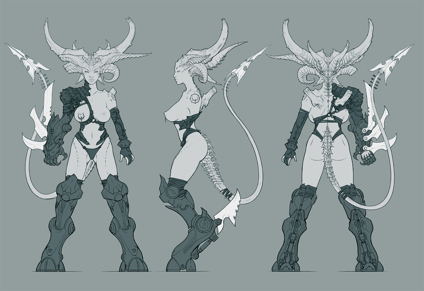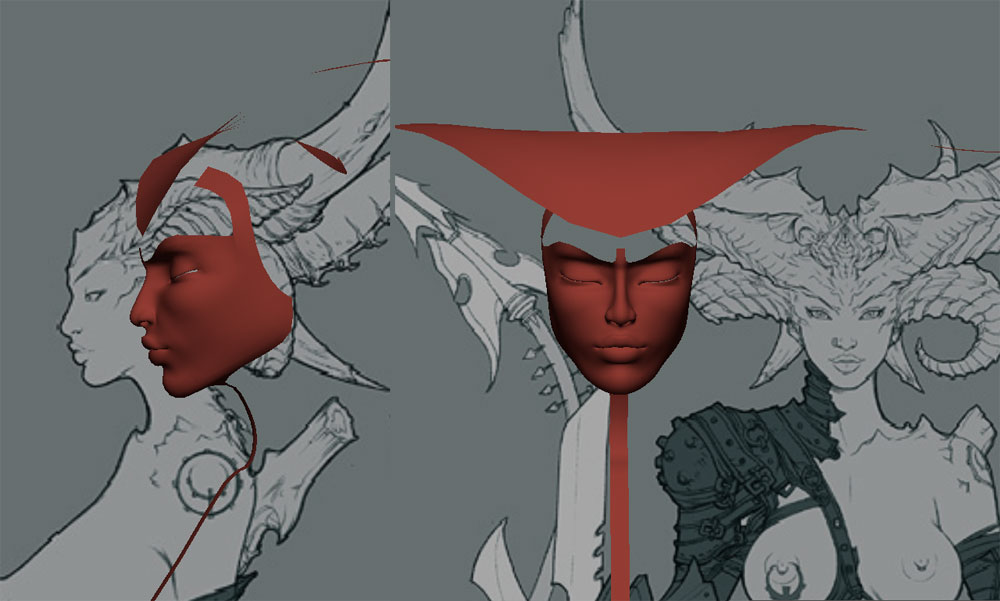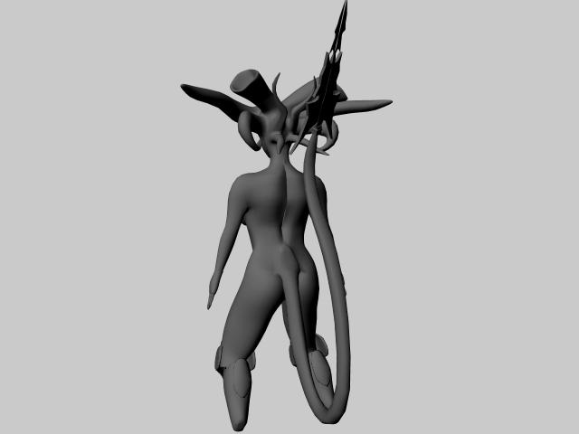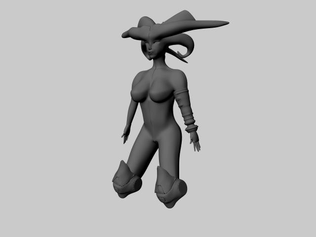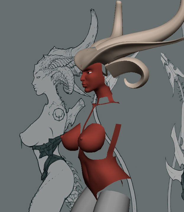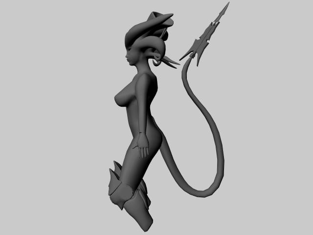Hoy he tenido una visita inesperada y he estado ocupado. Aun así, he dedicado un ratio al modelo. He retocado 1.001 veces la cara. Pero por más que lo intento, no consigo sacar el modelo igualito al del concept. Me consuelo pensando que la iluminación por defecto del programa, no ayuda a mostrar el modelo debidamente. Pero por más que lo miro, no dejo de ver una y otra vez a Esther cañadas, el tema de las tetas, me sigue dando un poco la vara. La unión entre la teta-hombro-axila no es fácil. La he hecho mill veces para acabar borrándola otras tantas, también está el tema de los quads. Al principio es sencillo modelar solo con quads, pero a medida que progresa el modelo la cosa se pone mala. A veces añadir una arista puede ser un infierno. De momento, como confío en acabar llevando el modelo a ZBrush para darle mucho detalle, procuro no cansarme mucho en algunos detalles, que quizás retocaré luego (eso siempre y cuando mi experiencia con el zetabrocha no sea tan traumáticamente estéril como la última vez. Ya podrían haberlo hecho un poco más intuitivo ese programa), el tema de la cola es complejo, parece que la muchacha tenga metido algo enorme por detrás. De momento no lo he acabado de arreglar, pero me huelo que también se me va a complicar el día, también me estoy planteando de ponerle orejas al personaje. Se me hace muy raro verla son los costados del cráneo pelados. Quizás con los cuernos quede mejor, pero de momento.