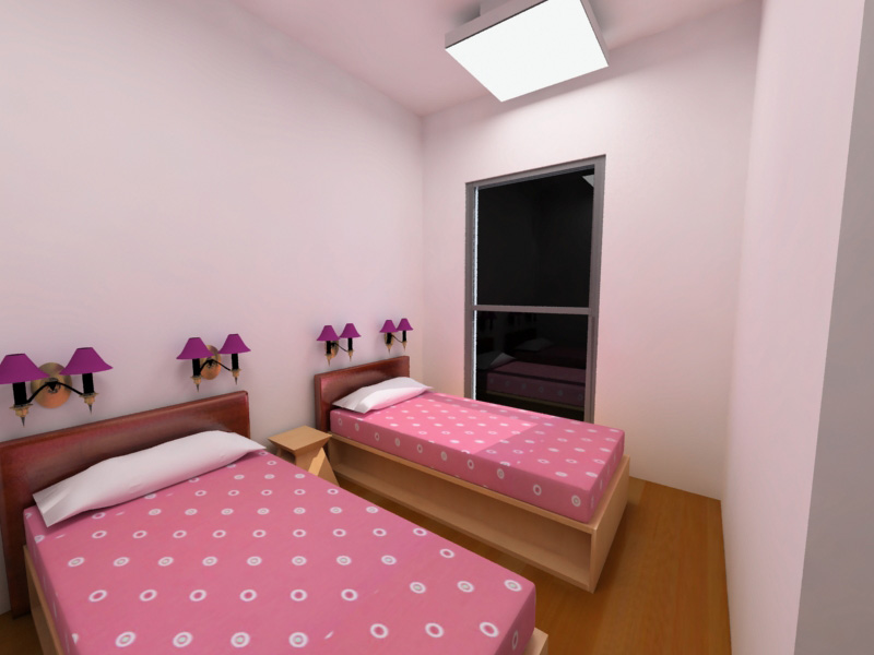 Ese efecto es producido por la radiosidad del color rosa de las camas, sobre el tono blanco de las paredes, y es correcto, dado que en un entorno real, se producirá el mismo efecto. A mi parecer no lo deberías quitar, un saludo.