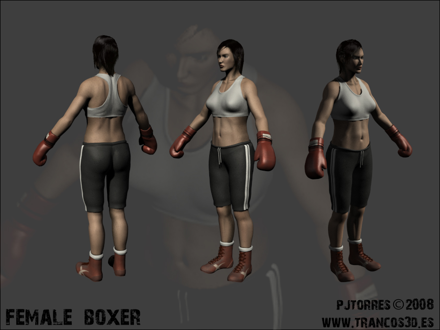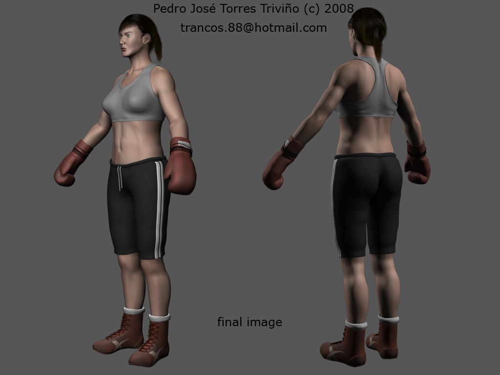 No ha ganado vidilla, ha mejorado un montón, sobre todo en la cara y el pelo, lo que sumado a los nuevos Shaders le añade mucho realismo al modelo (y porque además tiene una anatomía creíble para una boxeadora, vamos, que no es la típica modelo de pasarela con guantes de boxeo).Pues me vi con ganas y le hice unos retoques de tarde en Shaders sobre todo, mirando catálogos deportivos y demás. La parte de modelado la he tocado un poco respetando la topología que hice y bajo mi punto de vista ha ganado vidilla.