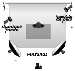 Dos luces en ambos laterales un poco por detrás un paso arriba de la frontal, y ésta con un flash anular, aunque también he visto algún que otro softbox.