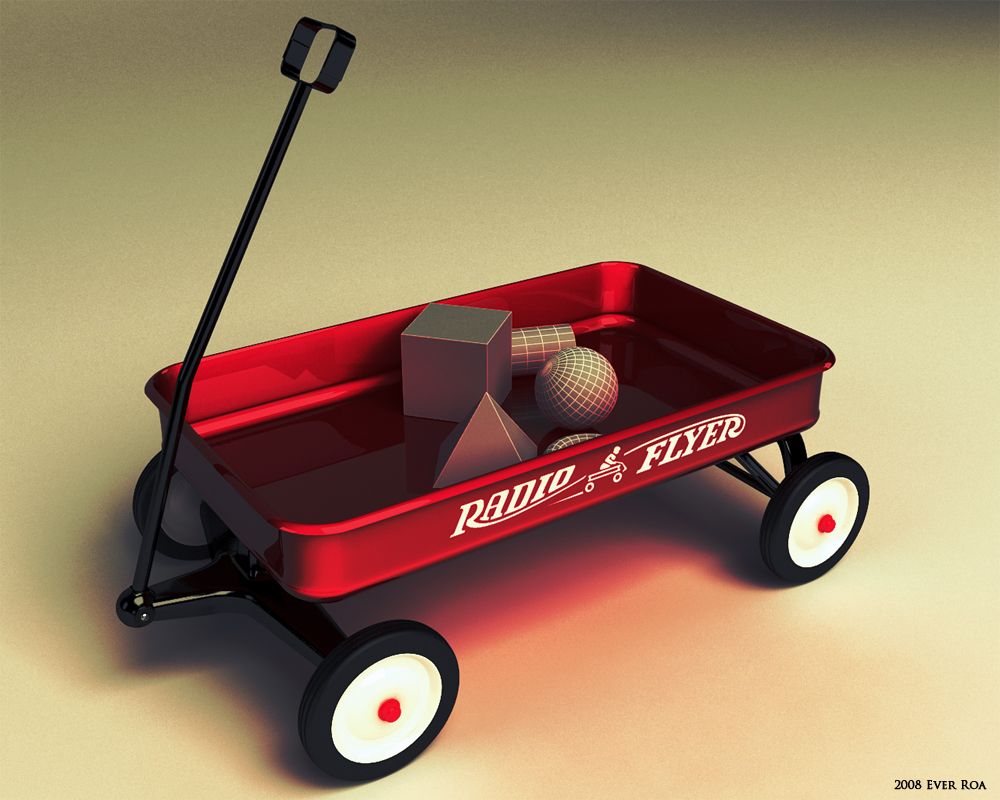 Hola, dejo en lo que estuve metido este día, por un momento tuve un exceso de confianza y pensé que tal vez podría intentar hacer un auto, por ahí tenía unos blueprints del Ferrari Enzo así que, comencé con ellos, pero a los pocos minutos me di cuenta de que estoy muy verde aún y todo acabo siendo un desastre. Entonces me fui por algo muchísimo más sencillo, el red wagon, seguramente lo han visto en alguna parte, ese pequeño vagonsito de juguete de antaño, yo en realidad nunca tuve uno, pero no sé por qué diablos anoche apareció mientras soñaba y se me ocurrió que lo modelaria.