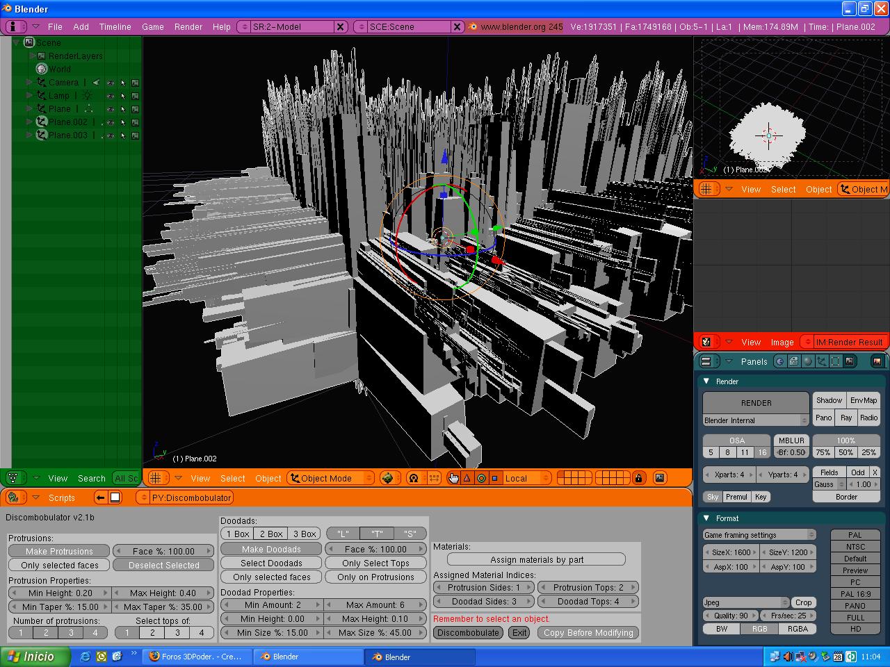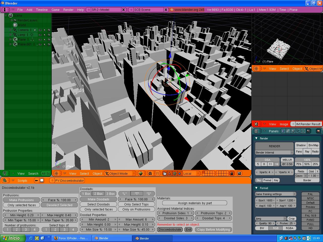 Sólo decir que el otro día se me ocurrió aplicar el Discombobulator sobre un plano subdividido varias veces. Dejando los parámetros por defecto aparece toda una ciudad, si además le damos a may+f podemos vaguegar por la vista como Superman.