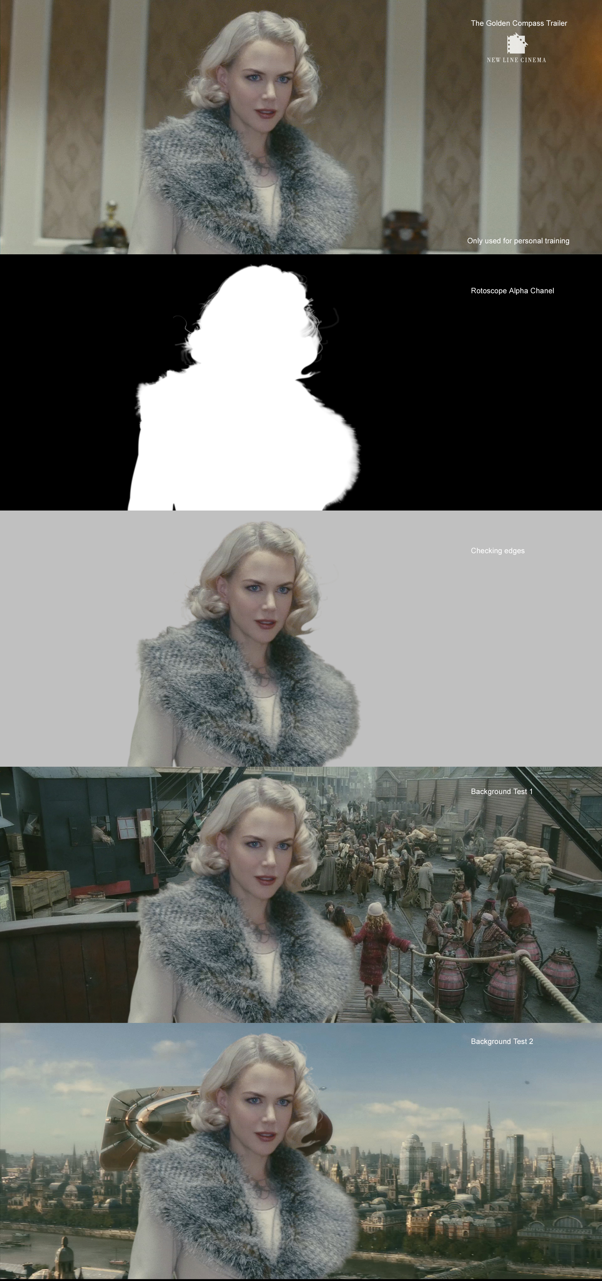 Hola a todos, como he terminado la secuencia del espartano he empezado con la de Nicole Kidman, en un plano sacado del tráiler de the Golden compass en calidad Hd. La secuencia final la podréis ver cuando complete la demo reel.