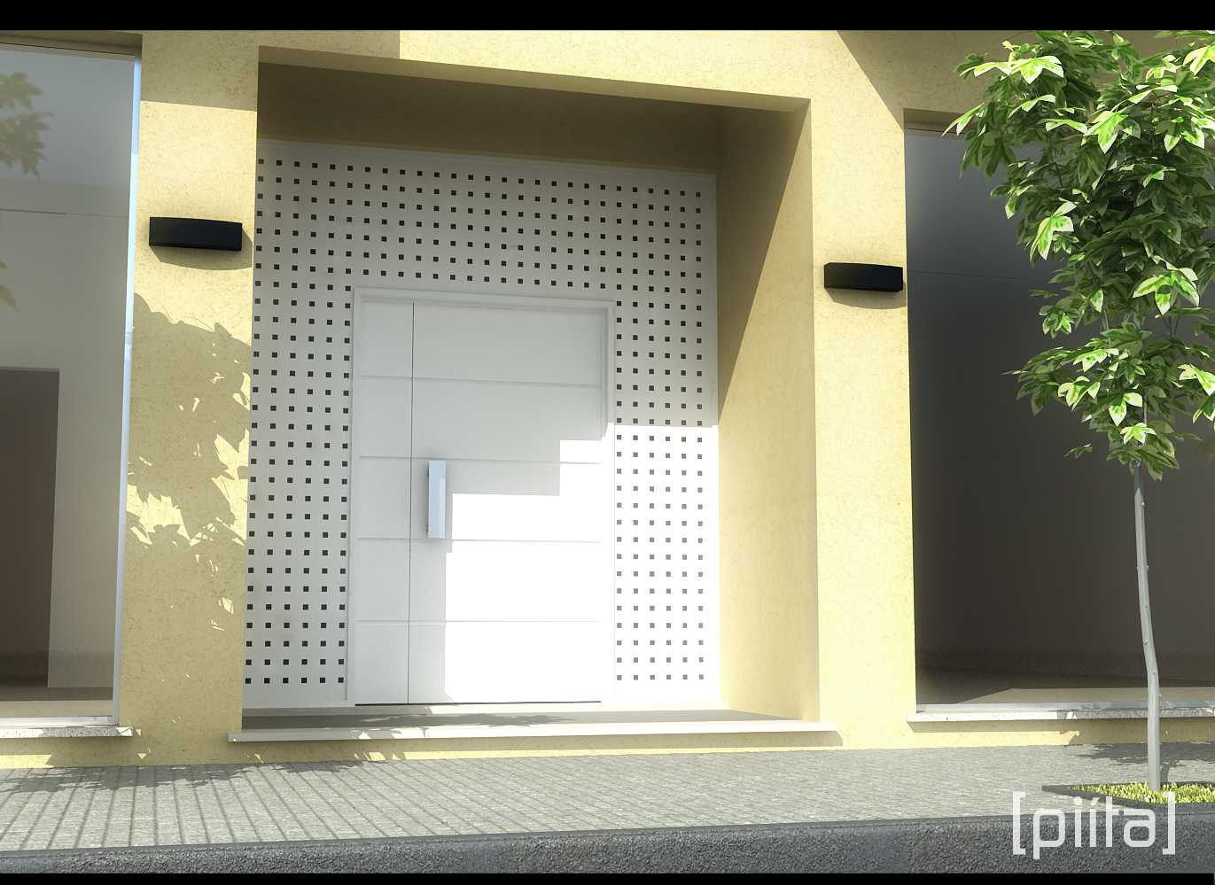 Subo dos imágenes, la primera esta tal cual salió de max, sin retoques. La segunda con un filtro en Adobe Photoshop. Usé v-ray1.5. Necesitaba mostrarle al cliente un detalle de la puerta de ingreso. Díganme que les parece. Gracias.