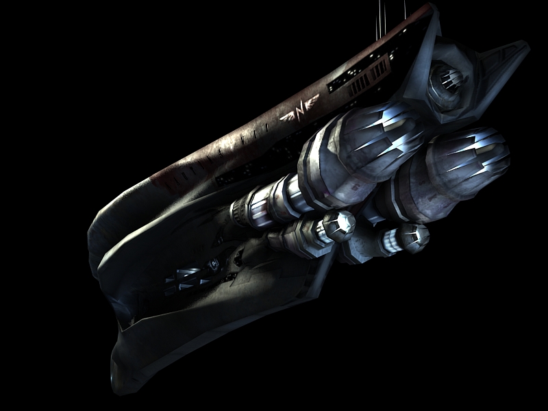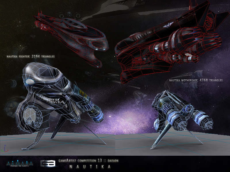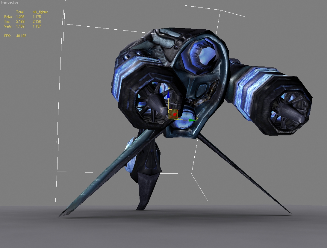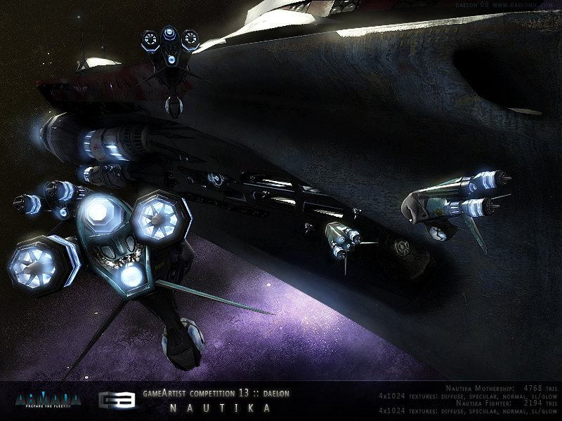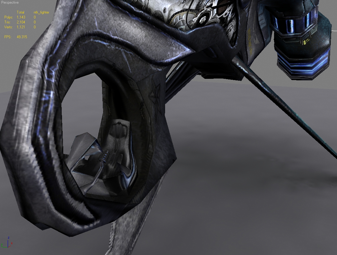 Son menos de 7000 polys entre los dos y unos 8 mapas de textura, 4 en 1024x y otros 4 en 512x (Diffuse, Specular, selflightning, normal) en el caso de la nave además tiene opacity, para ver el interior de la cabina, pero como en el concurso no está permitido pues no lo uso en el render.
