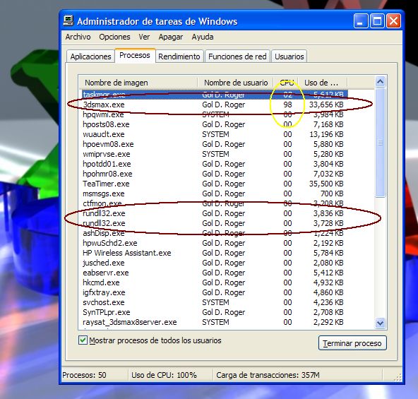 El proceso 3ds Max.exe ocupa el 100% de los recursos de la máquina.