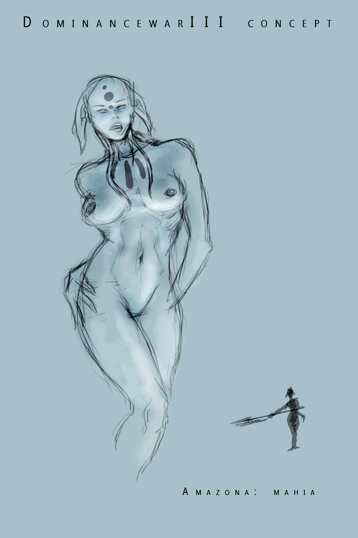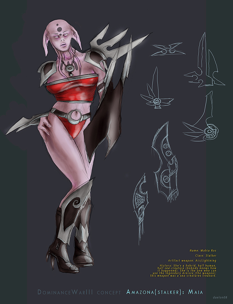 Historia: mahía era la decimocuarta hija del rey de esta raza de criaturas marinas, que los humanos llaman daren, una raza que se está extinguiendo (esto es en un futuro post-apocalíptico fantástico) y de todas sus hermanas ella es la última que queda con vida (una larga guerra acabo con el resto). Cuando el rey murió uno de los comandantes del ejército se hizo con el trono en contra de la línea de sucesión, y quiso matar a mahía, sin embargo, ésta eludió a los matones que le enviaron y regreso al palacio a recoger un tesoro que por derecho era suyo y solo ella sabia donde se guardaba, la lanza de las tormentas, areisze de la antigua civilización, (la historia de la lanza esta por ahí en el concept). Ahora es una exiliada y ha tenido que dejar el agua y empezar a caminar por la tierra para poder sobrevivir.