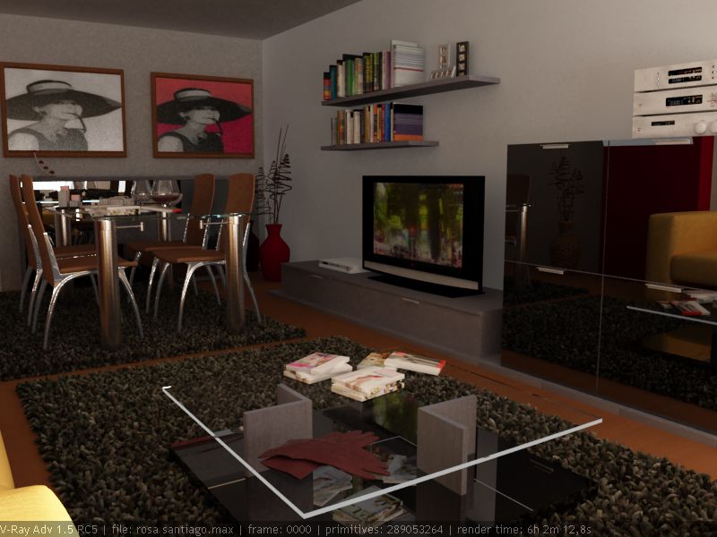 Hola de nuevo a todo el foro. Hacía tiempo que no me dejaba ver por aquí. Estoy con un interior en el cual tengo que colocar muchos objeto de reflexión como cromado. Los tiempos de render han ido aumentando según iba colocando objetos de este material. Quisiera pedir ayuda a alguien para que me ayude a estabilizar estos tiempos. El último render tardo 6 horas. Trabajo con 3dsMax 2008+ Vray 1.5 rc5. Tengo colocadas 3 varylight con 15,8 y 6. Y una Vray Physical Camera. Os dejo el último render, con los cristales lacados en negro, pero el render definitivo que estoy haciendo, tiene los cristales lacados en blanco. Un saludo de nuevo a todos y muchas gracias.