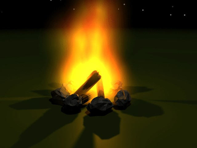 Ahora puede renderizar la animación. Quizá deba refinar algunos parámetros como el período de vida de las partículas. Puede añadir un mayor realismo a la escena animando las luces (o usando luces direccionales con sombra) y añadiendo un sistema de partículas de chispas al fuego. También es recomendado animar el emisor para obtener llamas mucho más vivas, o usar más de un emisor (render final.).